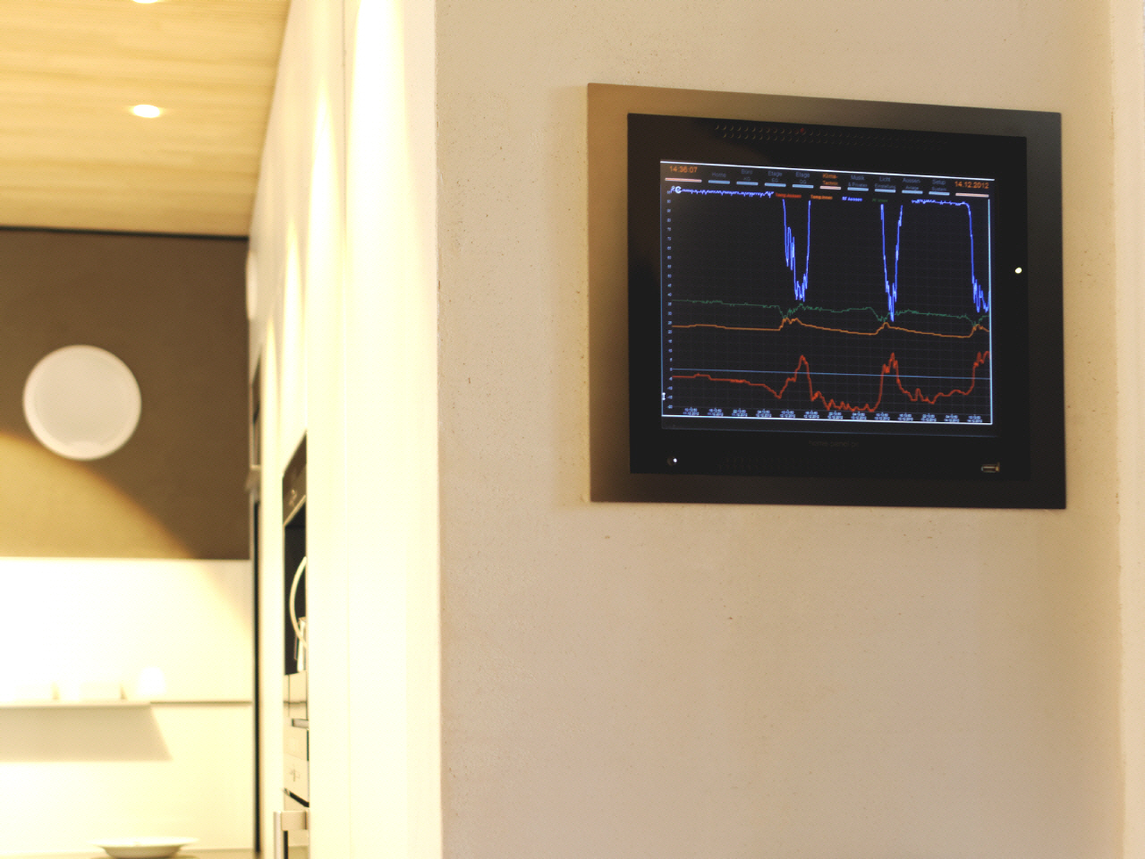 Auf dem Visualisierungsmonitor werden Erträge, Nutzungszeiten und CO2 Einsparungen dargestellt. Oft wird auch bildlich das Heizungsschema veranschaulicht, so daß Besucher einen Einblick auf die neue Technik bekommen.