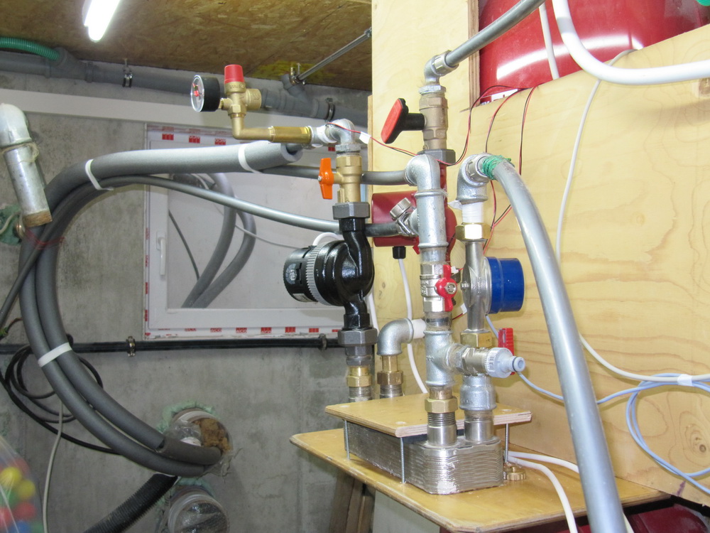 Durch einen Wärmetauscher im Biomeiler und einer isolierten Wasserleitung gelang die Energie in unseren Heizungsraum direkt zum Plattenwärmetauscher, der sekundärseitig am Heizungspuffer angeschlossen war.