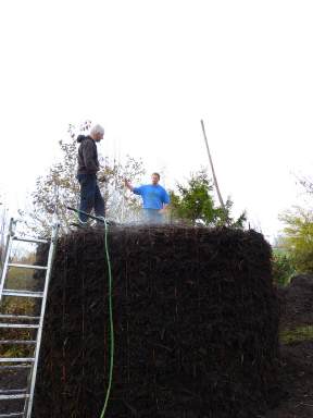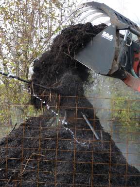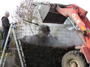 Das gehäckselte Grünschnittgut wird aufgeschüttet so daß der Wärmetauscher komplett umhüllt wird. |